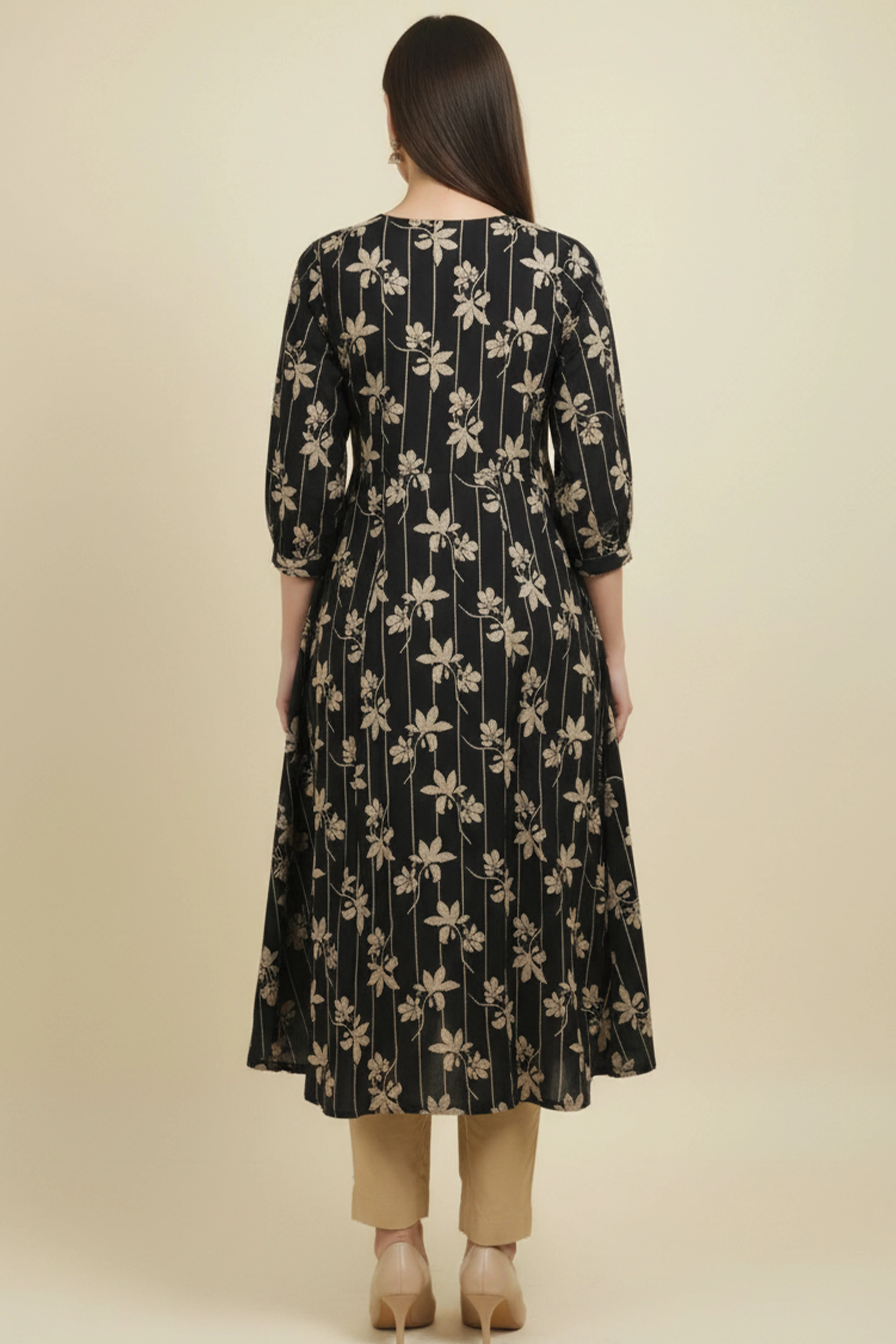 Modern Black A-Line Kurti in Viscose Fabric Accented with Floral Prints