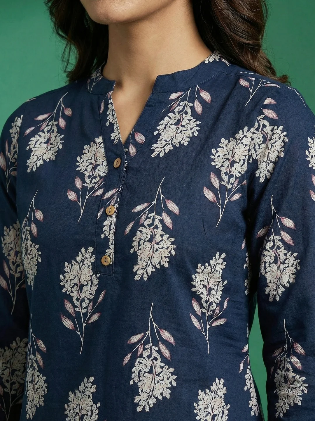 Navy Blue Floral Print Pure Cotton Top Crafted for Relaxed Casual Wear