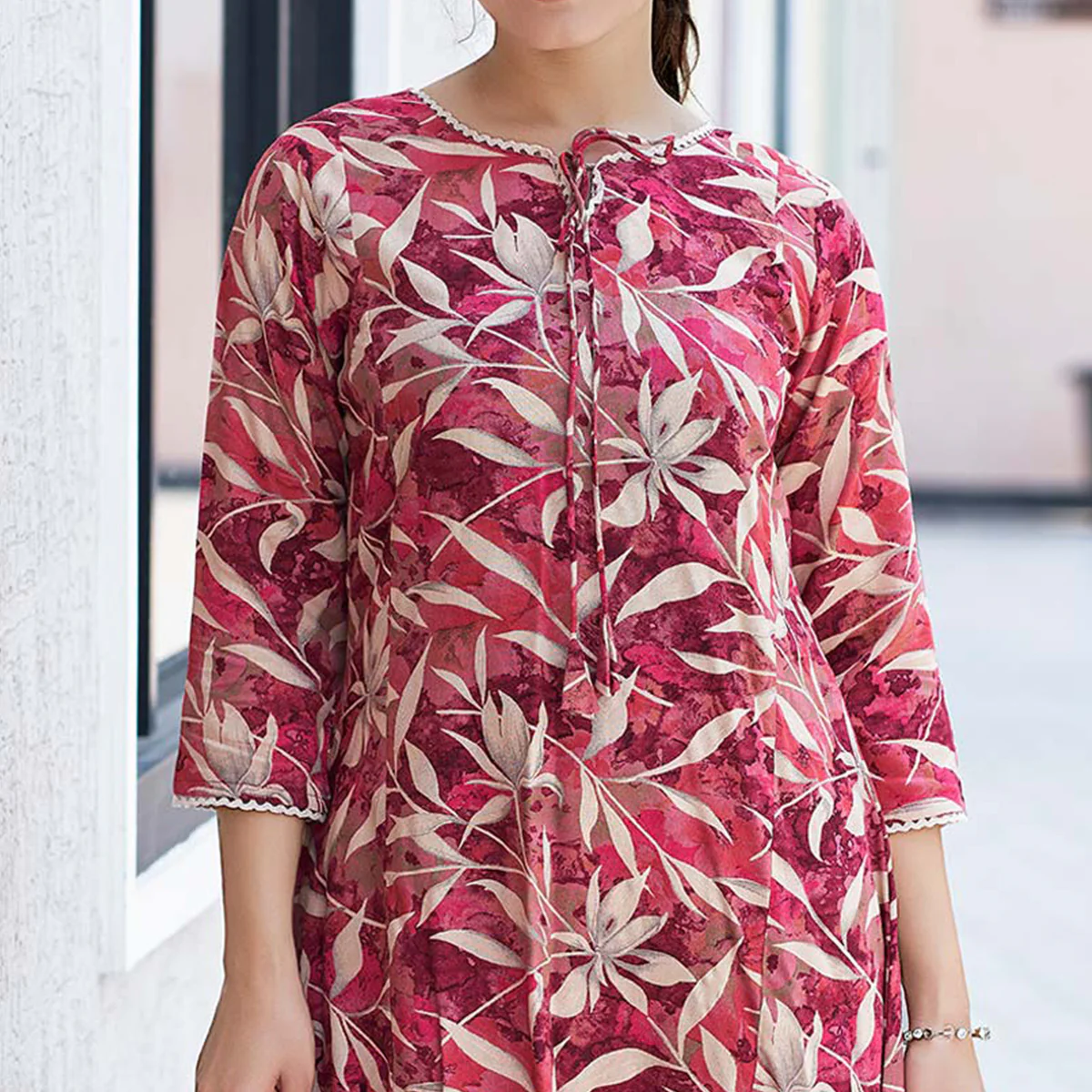 Peach colored co-ord set is prettified with floral print work with stone work as shown which makes it appear classy. This top is made of rayon fabric which is accompanied with rayon pant. Women can buy this set to wear for their casual, outing and other.