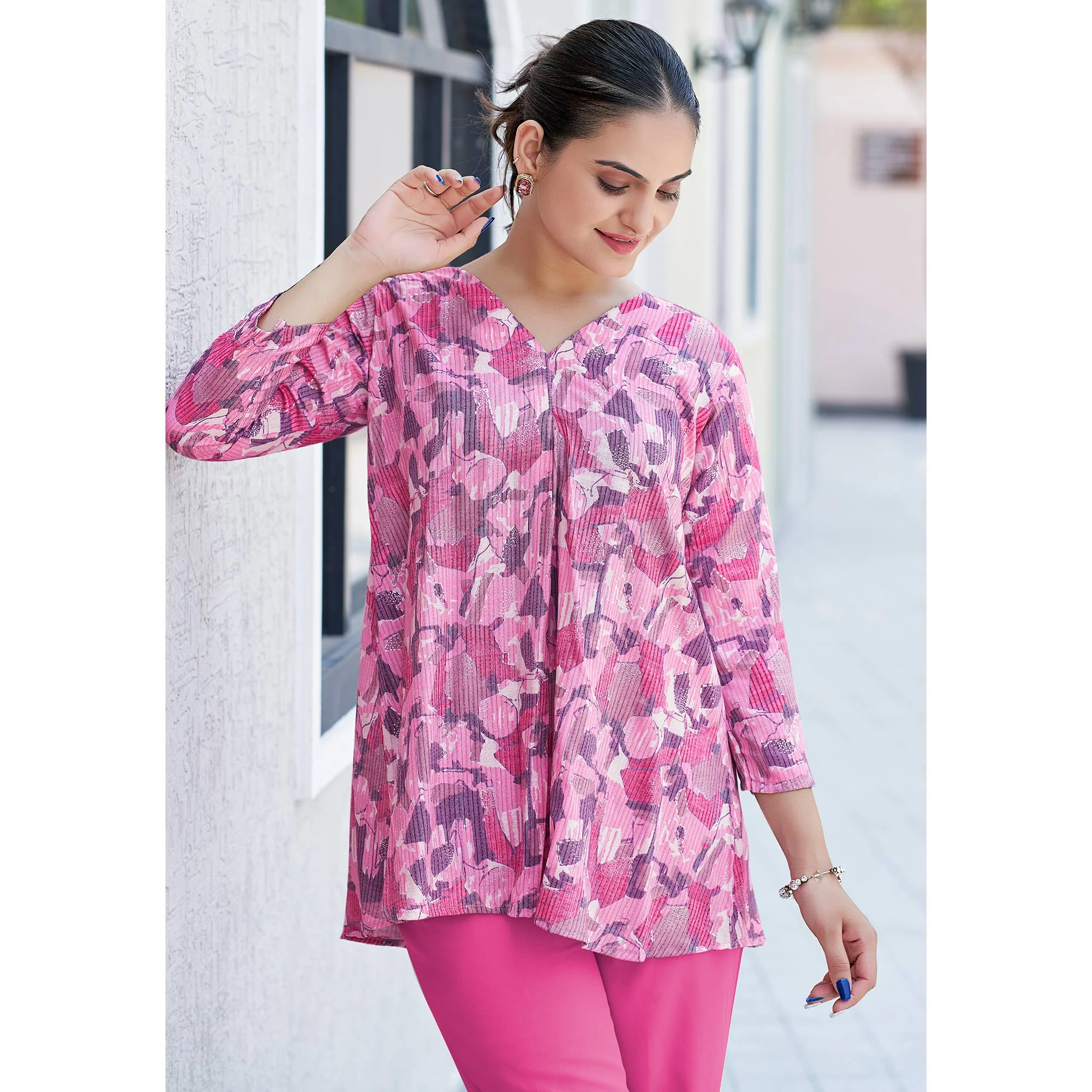 Pink colored top is fashioned on rayon fabric which is lightweight and assures the wearer a perfect fit & comfort. This stitched dress is beautified with printed work as shown. Ideal for casual, outing & get-together.
