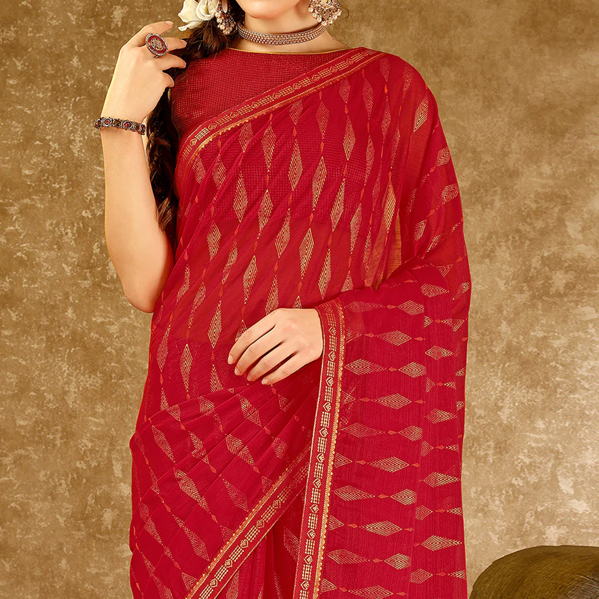 Red colored saree is made from chiffon zomato fabric which is highlighted with beautiful foil printed with lace border work as shown. comes along unstitched brocade blouse which you can customise as per your design/style. Occasion - You can wear this saree for casual and daily. Note:- The actual product may differ slightly in color and design from the one illustrated in the images when compared with computer or mobile screen.